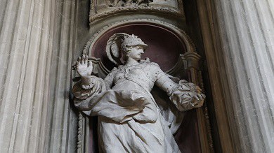 Relatives of the ruling family are portrayed along the nave, with inscriptions about individual virtues by their side. Above the statues, in the niches, episodes of the life of holy queens and empresses are depicted. Over the cornice there are the busts of the kings, as well as niches with queens and empresses. In the transept and presbytery, busts of popes and allegorical figures supporting medallions with bishops are on top of Este saints.