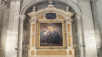 On the arch of the presbytery there is the fresco “Gloria di San Francesco di Sales” by Francesco Stringa, connected to Laura Martinozzi's personal devotion. The Altarpiece is by Francesco Stringa too, with Saints Agostino, Guglielmo, Monica and Tommaso da Villanova who are venerating the image of St Mary: this served as a frame for the 14th-century “Madonna col Bambino” by Tomaso da Modena, over the altar of the Madonna of the belt.