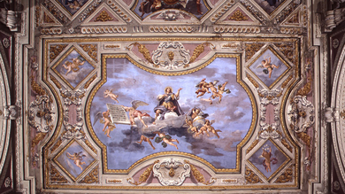 The painted ceiling was built with coffers painted with the glorification of some saints: St. Margaret of Hungary, the Glory of St. Henry the Emperor, the Beata Beatrice d'Este in the presence of Christ, Christ in glory flanked by the Virgin and St. Agostino, San Benedetto da Norcia and the glory of San Domenico di Guzman.