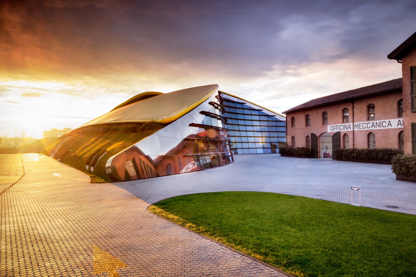 The sloping glass facade and metal roof are reminiscent of the imposing shape of a giant yellow car hood, evoking the traditions of the great automobile manufacturer, Ferrari.