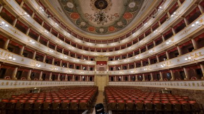 - Una cartolina acquarellata di un teatro e di una statua | Il teatro Comunale Pavarotti-Freni